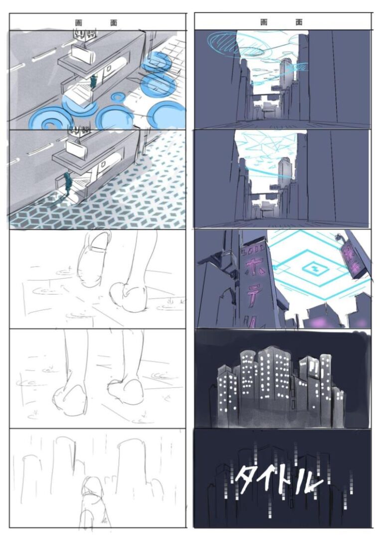 絵コンテとは動画制作における設計図です。想いをカタチする第一歩としてまずストーリーを具体化します。絵コンテにすることで完成イメージが沸き、作品における重要な要素になる背景、キャラ、台詞、CG効果などを決めて設計していきます。